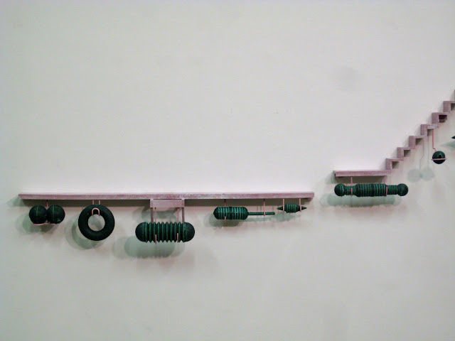 Two weeks in to this Off The Wall project and it is done for now. I ran out of materials before I ran out of enthusiasm. That's a good thing. Someone called the look 'steampunk'. I don't get that. I think trashpunk or junk punk is more apt. The slip-cast clay forms were from plaster molds taken from discarded plastic junk that I found. Here's a video and pictures.