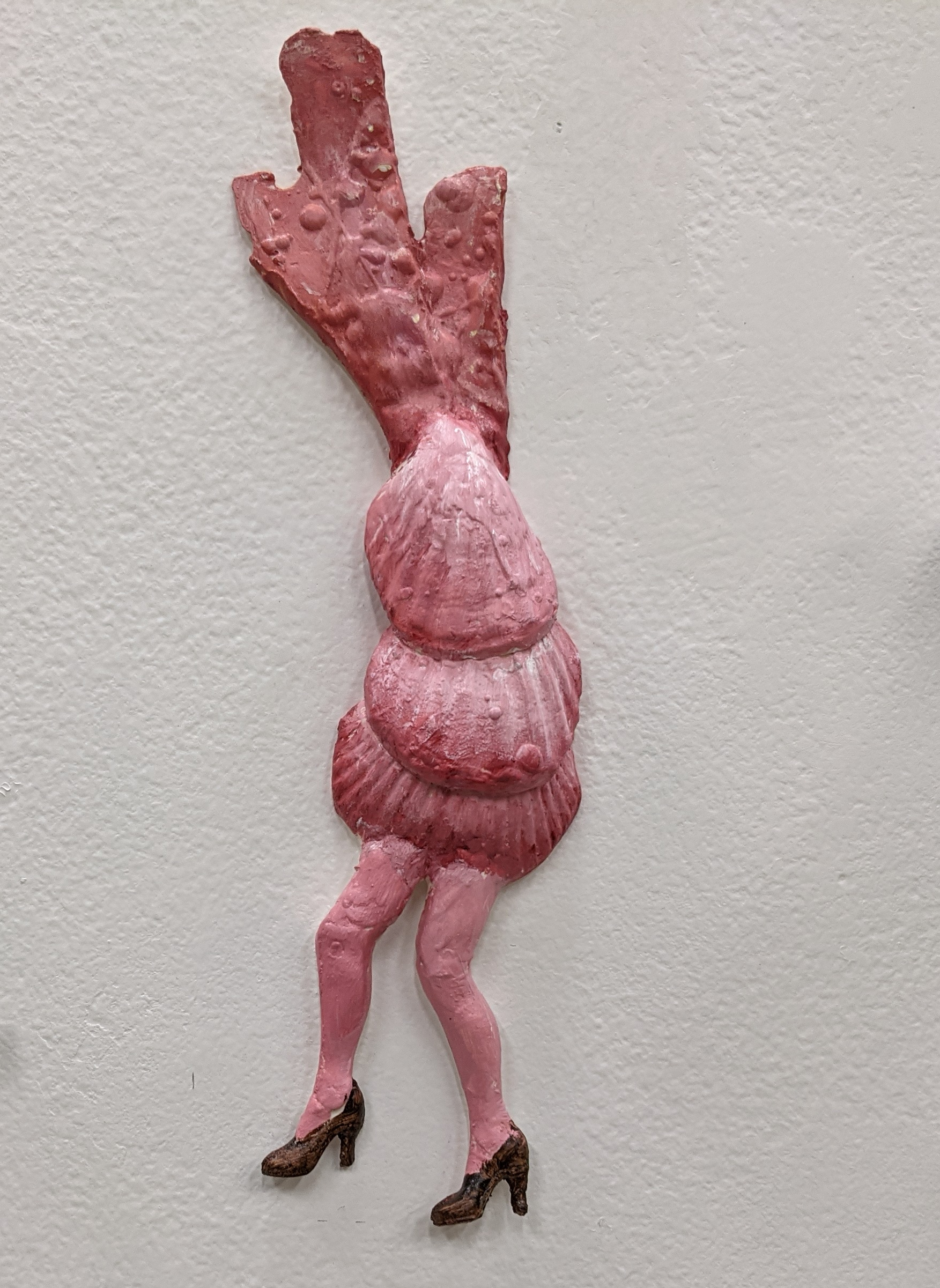 Metal makes lustrous colors but not vivid colors. A plague has made me crave vivid colors. These are some clay figures I made, Frankenstein style, random parts except for the legs. Acrylic paint, and I get a sense of maritime creatures. Maybe you don't. What about Speedo, white legs and black socks, a comedy classic?